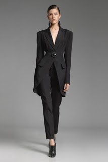 Основные детали коллекции : чёрные,белые,тёмно-синие и алые цвета;узкие юбки ниже колена, комбинезоны с маленькими топами, длинные шелковые туники, элегантные платья,шерстяные жакеты.